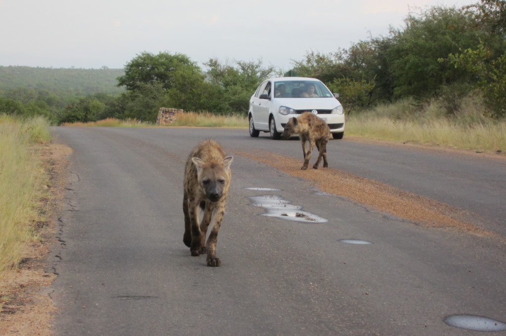 Unser zweiter Tag im Krüger Nationalpark begann bereits um 5 Uhr früh, da wir auf eigene Faust versuchen wollten, kurz nach Sonnenaufgang möglichst viele Tiere zu sehen. Als erstes lief uns ein Flusspferd vor die Kamera. Wenig später tauchten dann 2 Hyänen auf, die nicht nur unser Fahrzeug ausgiebig beschnüffelten sondern eine der beiden sogar ihren Kopf fast zur herunter gelassenen Scheibe hinein streckte.